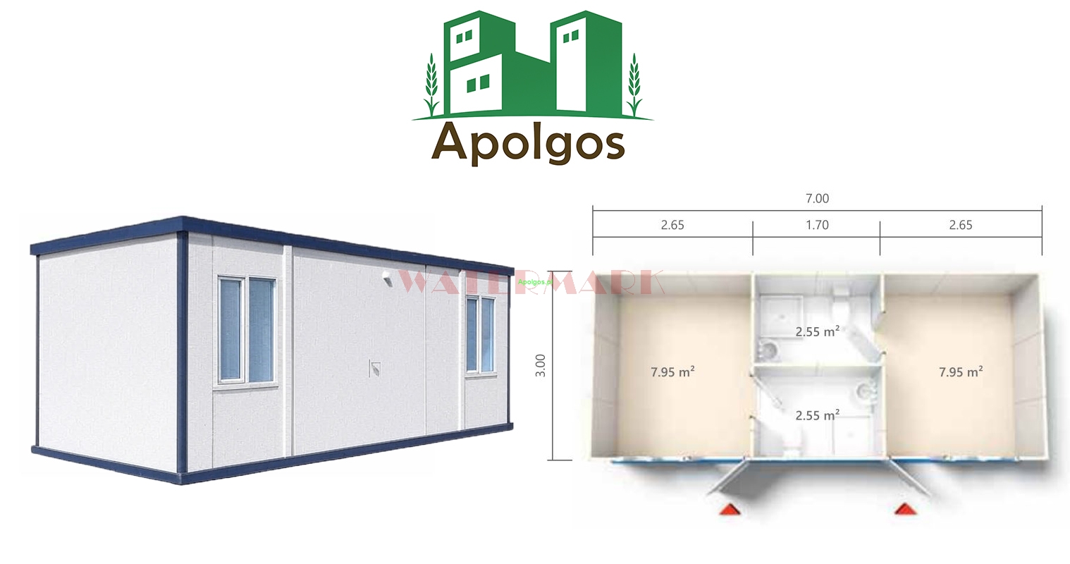 Kontener mieszkalny o wymiarach 700 x 300cm, o powierzchni 21m2