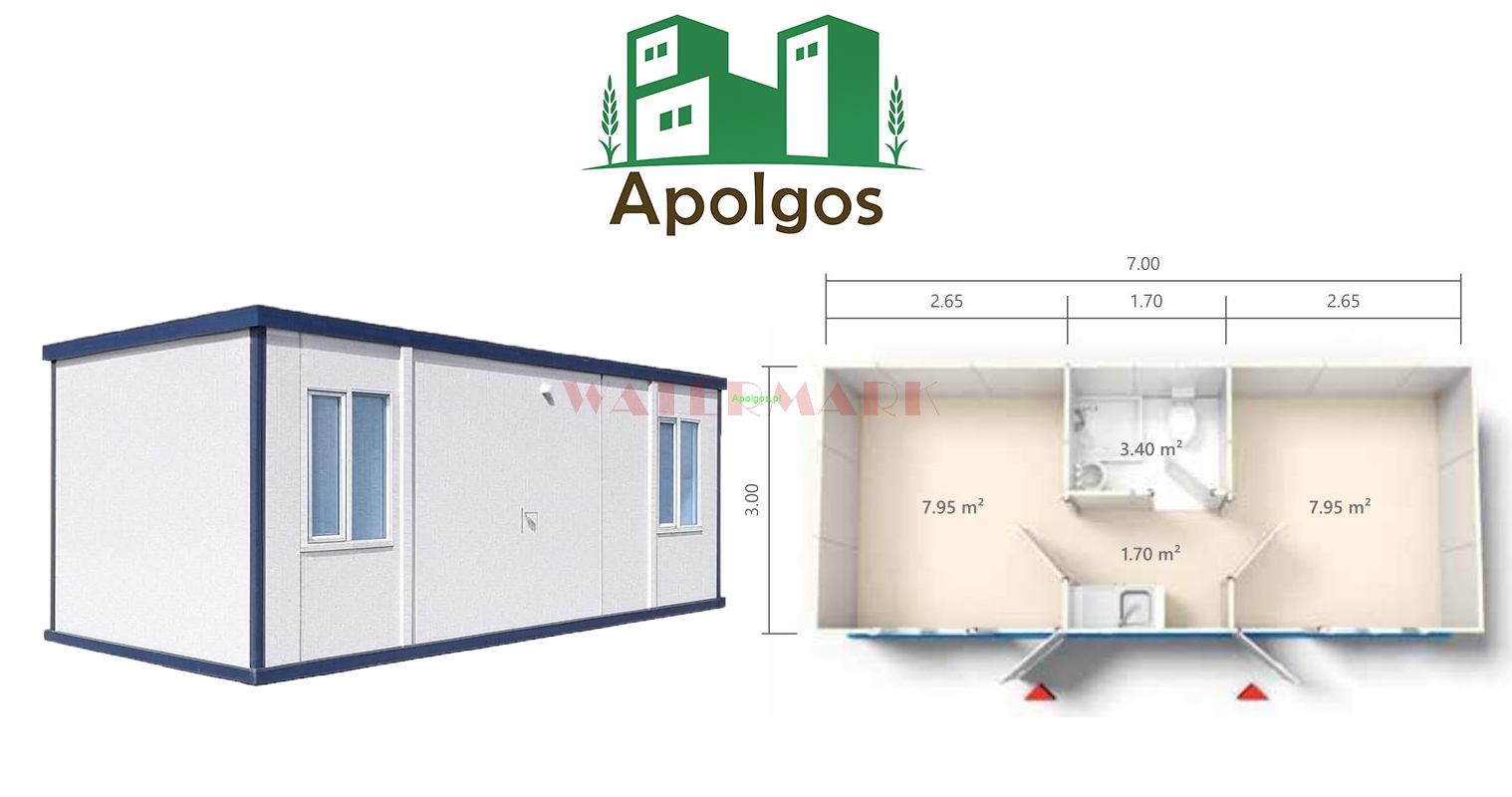 Kontener mieszkalny o wymiarach 700 x 300cm, o powierzchni 21m2